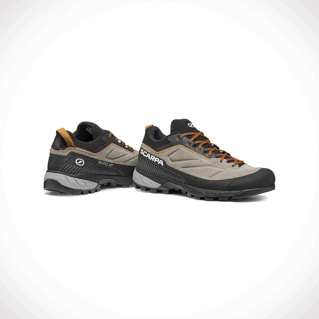 RAPID XT is the comfortable leather shoe suitable for approach, trail and light hiking with a clean design. Every detail is studied to ensure grip, comfort and protection such as the allaround TPU rand, which is abrasion resistant. The sole is Vibram® MegaGrip with climbing zones at the toe and Brake System in the back, ensuring stability and grip. The innovative shape, wide and ergonomic at the toe, is designed to follow the conformation of the foot.