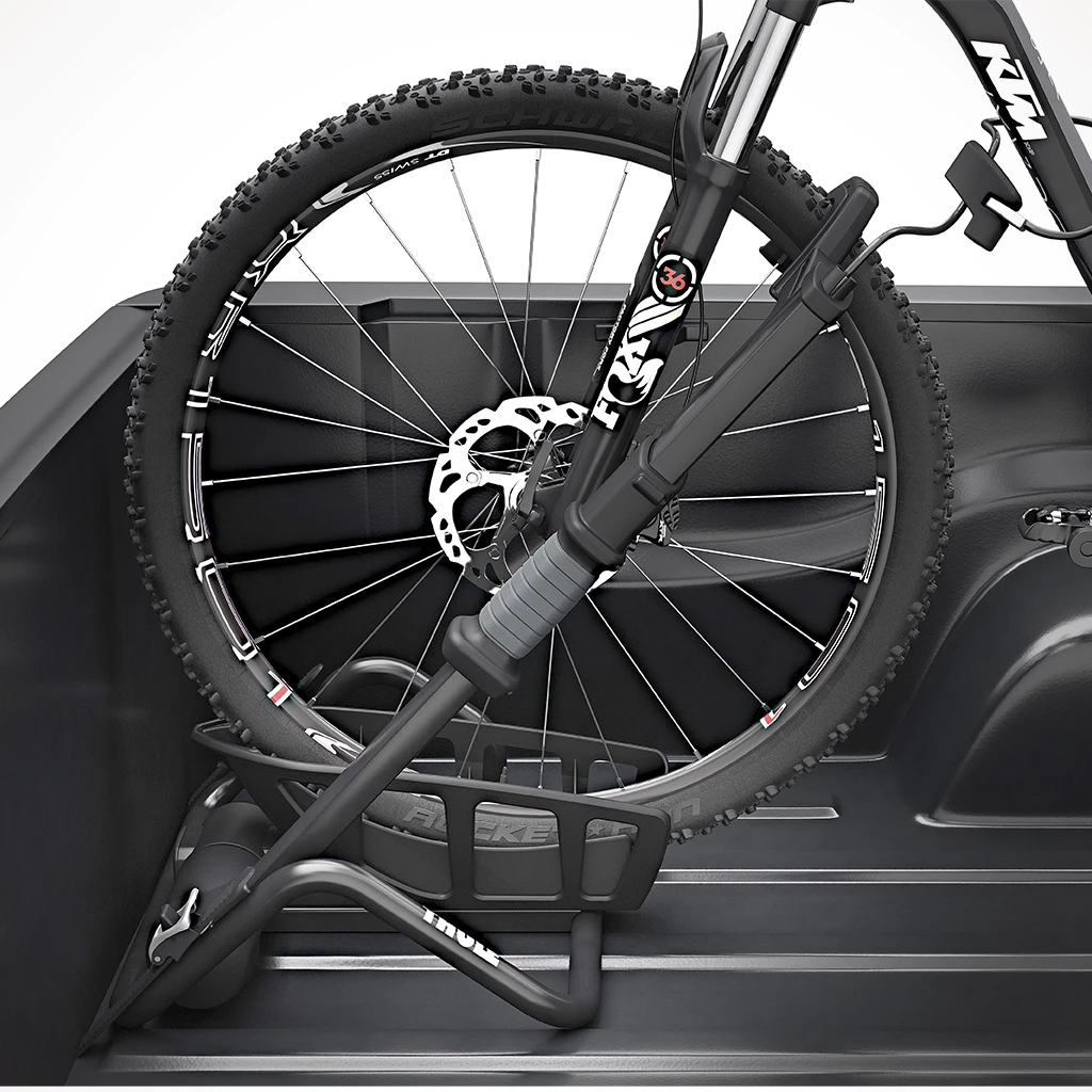 Fully adjustable, upright bike carrier designed for the inside of the truck bed.